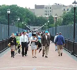 On January 11, 2013, the mayor's office announced the bridge would reopen for pedestrian traffic by 2014,[21] but in August 2014, the open was postponed to spring of 2015.[22] In May 2015, the Parks Department announced a July opening[23] and a July 25 festival.[24] The ribbon was cut for the restored bridge at about 11:30 a.m. on June 9, 2015, with the bridge open to the general public at noon.[21][25][26] The High Bridge was illuminated at night following its restoration.[27]