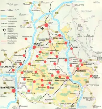 In the geomorphological division of the neighbouring Czech Republic, the Aš Hills (German: Ascher Hügelland; Czech: Ašská vrchovina), the Hazlov Hills (Haslauer Hügelland or Hazlovská pahorkatina) and the Cheb Hills (Egerer Hügelland or Chebská pahorkatina) are counted as part of the (High) Fichtel range.[6]