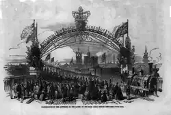 The High Level Bridge Over the Tyne: This important junction between the York and Newcastle and the Newcastle and Berwick Railway has been completed, and the event was celebrated on Tuesday last. In the afternoon of that day, a train of [specially invited] passengers passed along the temporary timber viaduct from the station at Gateshead to the station at Newcastle. Mr Hudson and several other Directors of the York, Newcastle, and Berwick line, who had been visiting Sunderland ... proceeded in a special train from that town to Gateshead... Several carriages were then added to the special train, and an open truck placed at each end, in which bands of music were stationed. The shrill sound of the whistle gave the signal for a royal salute, under the booming of which the train passed along the line, the band playing, and the thousands assembled to witness the event, rending the air with joyous acclamation Upon reaching the bridge, the bands struck up the well-known local air of "The Keel Row" which they continued till the train had reached the solid ground on the northern side of the river... The train proceeded to the Newcastle and Berwick station, where the company alighted and walked in procession to the Queen’s Head Inn, where a magnificent entertainment had been provided for the Directors and their friends, by the Mayor of Newcastle.