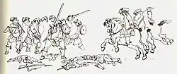 The Scottish and Irish warrior Alasdair Mac Colla is sometimes credited with inventing the Highland charge during the Wars of the Three Kingdoms[1] to meet a particular set of battlefield challenges.[2] It was initially known as the Irish charge, due to the Irish component of Alasdair Mac Colla's Royalist military invasion of Covenanter Scotland. The use of the charge greatly resembled older Celtic fighting styles of battle in which one side would rush at the other in an attempt to break the line of battle.[3][4]