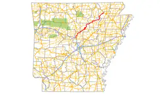 Arkansas Highway 25 is a north–south state highway in north central Arkansas. The route runs 127.36 miles (204.97 km) from U.S. Route 64 (US 64) in Conway north to US 63/US 412 in Black Rock through Heber Springs, Batesville, and the foothills of The Ozarks.[2][3][4][5]