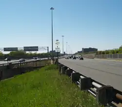 In the mid-1950s, the Toronto Bypass was constructed between Highway 2A and the Queen Elizabeth Way (QEW), widening Highway 27 to a four lane freeway in the process. This section was reconstructed again starting in 1968 and continuing until the early 1970s to turn it into a twelve-lane collector-express system. The junction with the QEW was built over 48.5 ha (120 acres) and required the construction of 19 bridges and the equivalent of 42 km (26 mi) of two lane roadway.[10] The junction with Highway 401 sprawls over 156 ha (385 acres) and required the construction of 28 bridges and the equivalent of 46.6 km (29 mi) of two lane roadway, the largest interchange in Canada.[11] The former was opened to traffic on November 14, 1969,[12] while the latter required several more years of construction staging, fully opening on December 4, 1971 (though portions were opened in the weeks prior to that), just prior to the renumbering of Highway 27 as Highway 427. The rest of the route was rebuilt prior to the completion of these interchanges. [13][14] In the new configuration, with Highway 27 being the continuation of Highway 427 collector lanes as they split off from the express lanes approaching Highway 401, Highway 27 received a half-cloverleaf interchange with Eglinton Avenue (originally meant for the never-built Richview Expressway), however Highway 27 lost its direct access to Highway 401 (although indirect access is available via Dixon Road). The isolated section of Highway 27 following Browns Line from south of the QEW to Lake Shore Boulevard (then Highway 2) was subsequently decommissioned.[15][16]