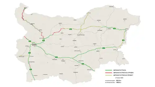 The initial plan for construction of motorways dates back to 1973, when the government of Socialist Bulgaria approved a resolution to build a motorway ring, encompassing the country and consisting of three motorways – Trakia, Hemus and Cherno More.[6] By the democratic changes in 1990, a total of 273 km of motorways had been built in Bulgaria.[7] By 2007, the year of accession to the EU, this had increased to approximately 420 km with predominantly state funding.[7] The EU accession of the country in 2007, and the improved in the recent years utilization of the allocated EU funds enabled Bulgaria to speed up the expansion of its highway network. As of December 2018, 800 km (497 mi) of motorways are in service, with another 38 km (24 mi) being under various stages of construction.