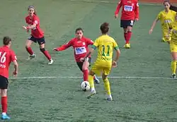 Hilal Başkol (red/black) driving the ball in the 2015–16 season's away match against Kireçburnu Spor