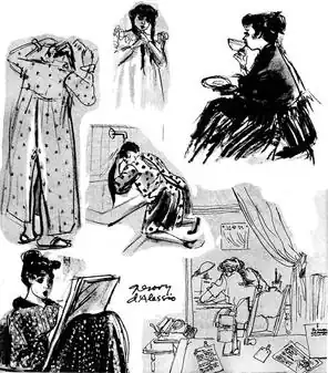 While working as a waitress, she studied art at the Art Students League. One of her teachers there was Gregory d'Alessio, and they married in 1938. She was signed by King Features Syndicate to create a feature comic strip, It's A Girl's Life, which would soon become Teena, the strip for which she is most well-known. The strip premiered December 7, 1941, and ran until 1964.[1] She also won a contest and a $100 war bond for the best "Waste-not" cartoon sponsored by the Office of War Information and the War Production Board in 1943.[3]