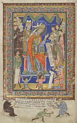 The manuscript of the Olomouc Collectarium is the most significant work created in Zdík's scriptorium. It has its origin in the 1130s–1140s and contains 446 illuminations. The most renowned scene from the manuscript depicts Pope Gregory the Great, who is surrounded by two groups of noblemen, clerics and Benedictine monks. Hildebert, Everwin and the monk R. (apparently the scribe of the manuscript) are depicted at the bottom of the scene.[3] During the Thirty Years' War, the manuscript was taken to Sweden as war loot, and is now in the National Library of Sweden (codex A 144).[6] In 2009, it was lent for research purposes to the Czech Republic.[3]
