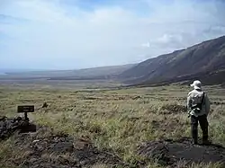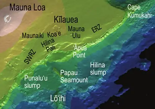 The Hilina Slump, on the south flank of the Kīlauea Volcano on the southeast coast of the Big Island of Hawaiʻi, is the most notable of several landslides that ring each of the Hawaiian Islands.[3] These landslides are the means by which material deposited at a volcano's vents are transferred downward and seaward, eventually spilling onto the seabed to broaden the island.[4]