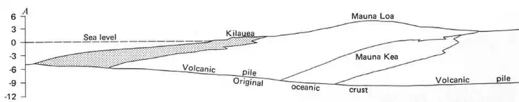 - ^ Māhukona (submerged, off the northwest corner of the island), Kohala, Mauna Kea, Hualālai, Mauna Loa, Kīlauea, and Lōʻihi (submarine). Moore & Clague 1992, p. 1471.