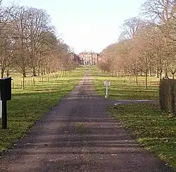 After the death of Captain Kingsmill Manley Power in 1888 Hill Court was bought in 1893 by Major Lionel James Trafford.[2] Major Trafford was succeeded in 1900 by his brother Guy Rawson Trafford who married Miss Dorothy Moffatt, the daughter of Harold Moffat. After the death of her brother in 1916 Dorothy became heiress to Goodrich Court and so the two estates were united creating one estate of nearly two thousand acres, spanning several parishes. Guy Rawson Trafford was Sheriff of Herefordshire in 1919.[3] In 1933 the main gate piers were moved to the position they are in today in front of the house, and details of the sad story connected with them can be found on a brass plate attached to one of the piers. It reads:- "These piers, moved from the east end of the avenue were in course of erection and the gates were in the making as a 21st Birthday present to Guy Harold Trafford when he was killed in a motor accident on his way to Queens College Oxford, 8 October 1933."
