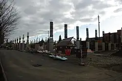A parking garage was part of Pacific University's original plan for the Health Professions Campus, and by September 2007 the city and school had received commitments for $7 million in funding out of a planned total price tag of $16 million.[1] At that time, officials hoped to begin construction in 2009 on a four-level structure.[1] In April 2009, the project was awarded $2.34 million in federal stimulus funds.[2] In February 2009, the city approved a contract with Skanska USA for construction of the project with a bid of $13.1 million.[3] Officials hoped to begin construction that spring, though the city still needed to find $4 million to fully fund the project.[3]