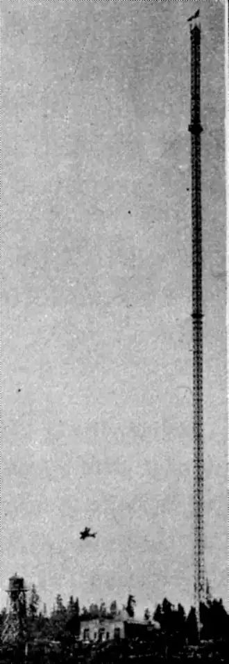 Federal Telegraph Company purchased property south of Hillsboro on September 20, 1920, from the Fred Rood estate, with completion of the project coming in 1921.[2] Federal paid $41,500 for the 331-acre (134 ha) site that was then three miles from Hillsboro.[3] The tower was built to replace a tower the federal government owned in Lents that the government removed and sent to Siberia during World War I.[4] The dedication of telegraph station KGH came on May 11, 1921, with a crowd of 500 and the Hillsboro mayor, A. C. Shute, in attendance.[5] Built on 330 acres (1.3 km2) the station had one large tower at a height of 626 feet (191 m) surrounded by eight shorter towers arranged in a circle around the main tower in the center.[2] Once complete, it was the tallest structure on the Pacific Coast, and the only taller structures in the world were the Eiffel Tower in France and the Woolworth Building in New York City.[6]
