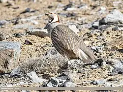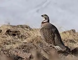 The Himalayan snowcock (Tetraogallus himalayensis) is a snowcock in the pheasant family Phasianidae found across the Himalayan ranges and parts of the adjoining Pamir range of Asia. It is found on alpine pastures and on steep rocky cliffs where they will dive down the hill slopes to escape. It overlaps with the slightly smaller Tibetan snowcock in parts of its wide range. The populations from different areas show variations in the colouration and about five subspecies have been designated. They were introduced in the mountains of Nevada in the United States in the 1960s and a wild population has established in the Ruby Mountains.