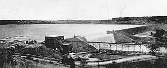 The dam is 3,700 feet long, mainly an earthen structure with a concrete core wall. At the creek channel there are gate chambers and a spillway 400 feet long. The masonry contents of this dam are 110,020 cubic yards, while the embankment amounts to 611,200 cubic yards. The maximum height of masonry above rock is 82 feet and the overfall at the spillway, 61 feet. The area of the reservoir at crest level is 4.46 square miles, its maximum depth is 75 feet and average depth of 28 feet. The reservoir's capacity is 3,445,000,000 cubic feet.[6]