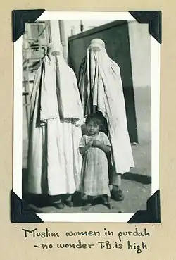 Both Muslim men and women wore the shalwar kameez,[35] while men also wore the sherwani.[36] Indian Muslim women in urban areas historically also wore a white purdah, which hung around the figure around a small skull-cap.[37]