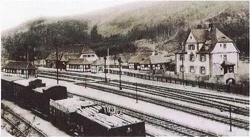 During this time, the railway station was managed by the Zweibrücken operations and construction inspectorate and its tracks were part of the responsibility of the Bahnmeisterei (track master's office) of Kaltenbach.[7] As early as 1914, it was renamed Hinterweidenthal, while the station in the south of the municipality of Hinterweidenthal was named Hinterweidenthal Ort (place).[8]