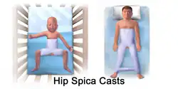 A hip spica includes the trunk of the body and one or both legs. A hip spica which covers only one leg to the ankle or foot may be referred to as a single hip spica, while one which covers both legs is called a double hip spica. A one-and-a-half hip spica encases one leg to the ankle or foot and the other to just above the knee. The extent to which the hip spica covers the trunk depends greatly on the injury and the surgeon; the spica may extend only to the navel, allowing mobility of the spine and the possibility of walking with the aid of crutches, or may extend to the rib cage or even to the armpits in some rare cases. Hip spicas were formerly common in reducing femoral fractures. Spica casts are used for treating hip dysplasia (developmental dislocation of hip).[1][2]