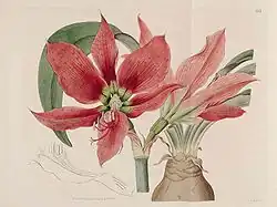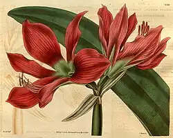 Hippeastrum aulicum is a bulbous epiphyte, growing on rocks and trees which has large scarlet flowers with a green throat, usually with four flowers to a stem. It blooms in late summer and autumn.[3]