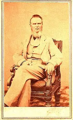 Due to his prominence in the Topeka area, H.W. became one of the first directors for the Atchison & Topeka Railroad on March 3, 1863.[5][d] Similarly, due to his background in education, H.W. was a founder of Washburn College, incorporated February 6, 1865, from Lincoln College. H.W. served on the board of trustees[6]: 191 of that college for twenty years. In October 1866 he was replaced as Indian Agent by President Andrew Johnson and then in December appointed by the president to be one of three commissioners to visit and inspect Indian schools.[4] In 1867 he accompanied the Indian tribal leaders to Washington, D.C., to sign treaties along with his Kaw Indian interpreter, Joe Jim. It was customary at the time that Indian chiefs visiting Washington be photographed in full tribal regalia with their Indian Agent. H.W. declined that honor because he felt the Indians were being cheated of their lands and hence he did not wish to be associated with such an endeavor.[10] [e] H.W.'s interpreter, Joe Jim, is credited for giving the name of Topeka to that town.[11]