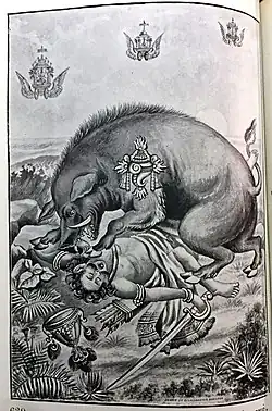 Hiranyaksha (Sanskrit: हिरण्याक्ष, lit. 'golden-eyed', IAST: Hiraṇyākṣa), also known as Hiranyanetra (Sanskrit: हिरण्यनेत्र)[2] was an asura king as per Hindu mythology. He is described to have submerged the earth and terrorised the three worlds. He was slain by the Varaha (wild boar) avatar of Vishnu, who rescued the earth goddess Bhumi and restored order to the earth.[3][4]