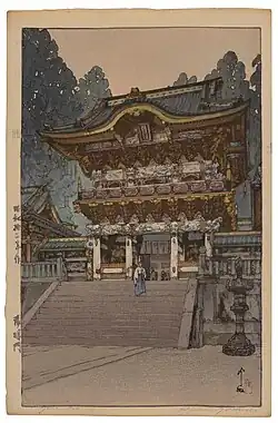His prints are characterized by an unprecedented layering of colors through multiple prints, with an average of 30 prints and often close to 100 prints. As a result, his works are rich in color and faithfully depict the atmosphere of landscapes and even the three-dimensionality of architecture. For example, Yōmeimon in 1937 was printed 96 times and Kameido in 1927 was printed 88 times to complete the work.[6][14]