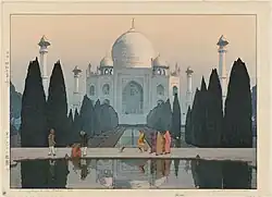 From November 1930 to February 1931, Yoshida and his eldest son, Tōshi, went on a sketching trip to India and Southeast Asia. It was his fourth travel abroad. He became so absorbed in sketching that after a full day of painting at one destination, he would take an overnight train to the next destination and sleep in the sleeping car. He chose a season when he could see the sunrise at Kanchenjunga under clear skies, and he checked the phases of the moon so that he could sketch the Taj Mahal on a full moon night. As a result of this sketching travel, he produced 32 prints in the India and Southeast Asia series.[9][10]