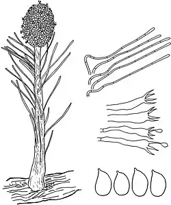The hairs on the stem are straight and point away from the substrate, emerging from the stems at oblique angles. They are 150 to 250 μm in length; at the base, they are 1.5 to 2.5 μm in width, while at the rounded to club-shaped tips, they are 3 to 4.5 μm in width. The hairs do not branch, have moderately thick walls and are somewhat septate. Individual cells in the hairs measure 10 to 30 μm in length.[5]