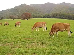 The Hiruzen Highlands, also known as the Hiruzen Plateau, known in Japanese as either the 蒜山高原 (Hiruzen Kōgen) or 蒜山原 (Hiruzen-bara),[1][6] is located entirely in Maniwa City, Okayama Prefecture at the southern foot of Hiruzen. The plateau has an elevation of 500 metres (1,600 ft) to 600 metres (2,000 ft) and measures 20 kilometres (12 mi) east to west and 10 kilometres (6.2 mi) north to south.[2][5] Known as a Resort area within west Japan, it receives the second highest number of tourists per year (25 million) within the prefecture after Kurashiki City (30 million). The plateau and its surrounding areas have been developed for recreation, specifically skiing and camping. Hiruzen Jersey Land, the largest Jersey cattle ranch in Japan, is also located on the plateau. Hiruzen Horse Park offers horseback riding on the plateau.[4][9]