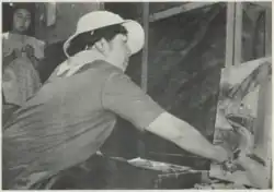 While interned in Tanforan and Topaz, Hibi created seventy-two paintings and taught classes in drawing, painting (oil and watercolor) and sculpture to students at the Topaz Art School, which was the resumption of the Tanforan Art School.[19] While both Hibi and her husband George were influenced by late nineteenth-century European and American painters, Hibi was particularly influenced by the work of Mary Cassatt.[26][27] Many of her oil paintings from the camp years depict the intimate daily life of mothers at work, the cold sterility of the barracks, and images such as persimmons and New Year's rice cakes, that symbolized a nostalgia for a previous life. In 1943, she received a prize for a still life of flowers[28][29][30] that was exhibited in a show of work made by incarcerated artists that was held at the Friends Center in Cambridge, Massachusetts.[2]