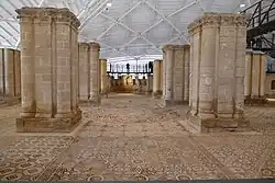In 2021, the restoration of the bath complex's 835-square-meter mosaic floor was completed, at a cost of 12 million USD and with Japanese funding,[30] with a dome-shaped shelter protecting the mosaics, which was designed and executed by a Japanese architecture office.[31] The mosaics can be viewed from walkways suspended over the floor.[31]