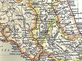 Some of the land of the Valle Umbra was brutally confiscated by Augustus to found colonies there as a reward for tens of thousands of Caesar's veterans who had fought for the Triumvirate and additionally, tens of thousands of them who had fought for the Republican cause in the war at Philippi.[9] This led to the Umbrian revolt culminating in the Perusine War (41-40 BC).[10] Hispellum supported Augustus in the Perusine War and became Colonia Julia Hispellum in ca. 41-40 BC.[11] Augustus also favoured Hispellum by extending its territory to the springs and sanctuary of the Clitunno,[12] 20 km distant, which had originally belonged to the territory of Mevania, and the city provided a public bath and accommodation there.