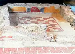 - a villa rustica in via Baldini from the 1st/2nd centuries AD with thermal baths in 3 rooms. It was sited on a necropolis of the Republican age. The walls are preserved to their full height in the SE corner where part of a basin with stone slabs covered in cocciopesto has been brought to light: In the southwest corner are remains of the lower part of a square basin and tiled flooring in tiles (perhaps a settling tank), as in the immediate vicinity are traces of a furnace.