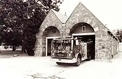 The former Station No. 12 in Woodlawn is a Tudor Revival structure built of stone. An L-shaped building, the two-story residential portion meets the one-story, double gable-roofed garage at a conical tower. The tower contains a spiral staircase with two-over-two-over-two windows along it, giving an offset appearance from the outside. The garage opens to an alley rather than directly onto the main street.[9] The station was renovated and now houses the Birmingham Dream Center, a church outreach ministry.[10] The current Fire Station No. 12 is at Woodlawn 6449 First Avenue North.