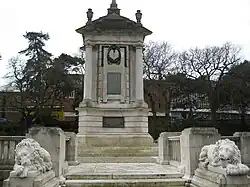The Pleasure Gardens are still an important landmark and the Central Gardens contain the town's impressive war memorial, guarded by two stone lions. The War Memorial was installed in 1921 when the Borough Council moved to the adjacent Mont Dore Hotel, which it still occupies. Various building works were carried out – such as the Saint Stephen's Road bridge – to stamp the municipal identity on this area of the town; the war memorial was one of them. It was designed by Bournemouth's deputy architect Albert Edward Shervey, who copied the two lions (one sleeping, the other awake and roaring) from Antonio Cavona's lions which guarded the tomb of Pope Clement XIII.
