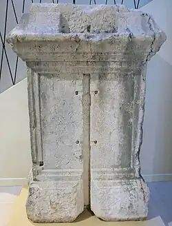Some votive altars[46][note 4] and a tombstone found in Castel Goffredo and preserved at the Brescia Civic Museum also suggest a settlement in the Roman period (1st century A.D.).[47] Prominent among the finds is the so-called "funerary stele of Publius Magius Manius" found in Casalpoglio, one of the most remarkable archaeological testimonies ever discovered in western Mantua.[48] The following is the text of the inscription: