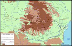 Literary sources begin to mention the Dacians, as a population inhabiting, from the beginning of the second century BC, the interior of the Carpathian mountain arc. In fact, Pompeius Trogus tells of the conflict that led the then Dacian king, Oroles, to beat back and repel an incursion of Bastarnae Germans, who had attempted to penetrate from the east, into the fertile plains of the middle reaches of the Mureș river.[6] A new conflict with the Bastarnae occurred in 112-109 BC, but again they were repulsed, failing to weaken the power of the Dacians, which on the contrary increased, so much so that it is precisely at this time that we can discern the shift of the Daco-Getic power center from the plains of Wallachia to the heart of Transylvania.