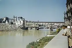 During the German retreat, Florence was declared an undefended "open city", prohibiting further shelling and bombing in accordance with the Hague Convention. On 4 August, the retreating Germans decided to detonate charges along the bridges of the Arno linking the district of Oltrarno to the rest of the city, thus making it difficult for the New Zealand, South African and British troops to cross just before liberation. The German officer in charge of the demolitions, Gerhard Wolf, ordered that the Ponte Vecchio was to be spared. At 04:00 on 4 August 1944, an armored patrol of the South African Imperial Light Horse and Kimberley Regiments found the Ponte Vecchio bridge intact, crossed the bridge under heavy German shelling and subsequently became the first Allied soldiers to enter Florence.[14] Before the war, Wolf had been a student in the city, and his decision has been honored with a memorial plaque on the bridge. Instead, an equally historic area of streets directly to the south of the bridge, including part of the Corridoio Vasariano, was destroyed using mines.[15] Since then, the bridges have been restored exactly to their original forms using as many of the remaining materials as possible, but the buildings surrounding the Ponte Vecchio have been rebuilt in a style combining the old with modern design. The last days of battle for Florence were very intense because the Italian Fascists resistance skirmish known as Franchi Tiratori.[16] The Allied soldiers who died driving the Germans from Tuscany are buried in cemeteries outside the city, i.e. British and Commonwealth soldiers a few kilometers east of the center on the north bank of the Arno[17]), whilst Americans are about 9 kilometers (5.6 mi) south of the city.[18]