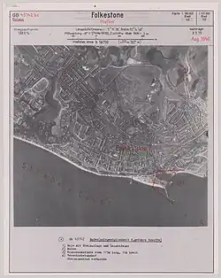 At the very beginning of that war thousands of school children were evacuated to the town, but were soon sent elsewhere in 1940. Within a few weeks Folkestone became a prohibited area and 35,000 residents left. Defences around the town were set up: tank traps, barbed wire surrounded it, and gun batteries set upon the heights. In this war the town was under constant attack: bombs and shelling (from across the Channel) and later flying bombs caused immense damage, and Folkestone was to be changed forever.[2] Casualties were high: 123 people were killed, and 778 injured. 550 houses had been destroyed, 14,441 properties damaged.[21] It took almost twenty years before Folkestone was again to become a holiday resort.