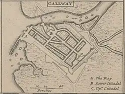 Nevertheless, Galway retained its distinctive physical character. The following account was given of lord justice Sir William Pelham's visit in 1579: "His lordship removed into the towne of Galwaie, twelve mills, verie rocky way, and full of great loughes. The townw is well bulte, and walled, with an excellent good haven, and is replenished with many welthie merchants. The townes-men and wemmen present a more civil shew of life than other townes in Ireland do, and maie be compared, in my judgement, next Dublin and Watterford, the only towne".[6]