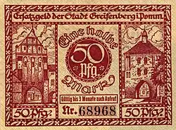 Despite the intensified emigration of Gryfice's population to overseas countries and more developed centers, the city continued to develop economically in the period preceding the outbreak of World War I. In 1913, the population exceeded 7,300.[95] Workers flowed into Gryfice, finding employment in the local sugar refinery and surrounding estates. Their number reached several hundred. During World War I, the city was attributed with economic growth. Sparse data from those years do not allow to determine the extent and areas of social life in which this growth occurred; however, historiography suggests that it was primarily in the agricultural sector.[96]