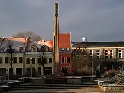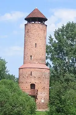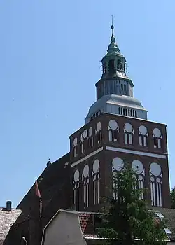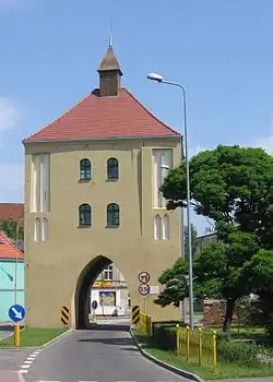 At the end of the 13th century, the construction of the brick St. Mary's church with three naves began, and in 1300, the construction of defensive walls surrounding the city.[37] Their total length reached 650 meters with a span of 200–350 meters. The city fortifications were enriched with 3 gates (High Gate with a foregate, Stone Gate, and Rega Gate with a barbican), 3 shooting towers (Powder Tower, Bridge Tower, and Mill Tower), numerous bastions, and a moat.[38] The municipal council consisted of 9 to 12 councilors. Every year on St. Michael's Day (September 29), 1/3 of the council was changed. The authorities took over lower judiciary functions.[39] In 1316 and 1357, the city entered into alliances against robbers who conducted raids, plundered, and attacked neighboring villages. These alliances restored the normalization of life and economic development.[40]