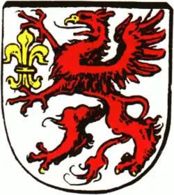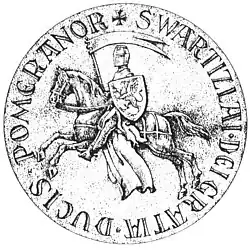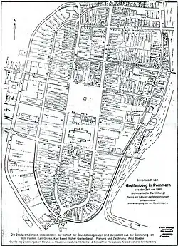 In the mid-13th century, the rulers of Pomerania were the princes from the Pomeranian House of Griffin, Barnim I and Wartislaw III, who encouraged settlement in these areas to strengthen their power. Barnim I, the Duke of Szczecin, ruling the eastern areas, settled mainly German population here, while Wartislaw III, the Duke of Demmin, ruling the western areas, encouraged Dutch and Danish settlers to settle. From 1234, Barnim I and Wartislaw III competed with each other in founding cities. Wartislaw founded Greifswald, Demmin, and Kołobrzeg. In 1262, he issued a town charter based on Lübeck law, in which the settlement (composed of three villages) received town privileges and 100 lans of land in the vicinity of the lower Rega river. The town charter designated the city's name as Nova civitas supra Regam (New city above the Rega). Lokator of the city, Jakob von Trebetow, received 20 lans of land and the task of founding the city.[28] After the death of Wartislaw III, the owner of his lands became Barnim I, who confirmed the grants of location and rights. From his time comes the name of the city – Civitat Griphemberch super Regam (Gryfia Góra – city above the Rega) from 21 September 1264. The locality received customs rights, forest clearance, navigation on the Redze river and coastal waters, temporary tax exemption (for 10 years), enabling it to become significantly wealthier.[29][30]
