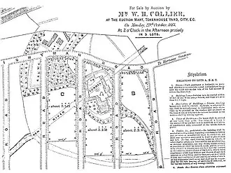Most of the auctions for both estates took place in the Auction room adjoining the Queen's Head Tavern, Green Lanes. On 7 July 1881 a local press advertisement appeared announcing the auction of the first portion of the Station estate.[3] More than a year later, in September 1882, an advertisement announcing the auction of the first portion of the Harringay Park Estate appeared.[4] This delay in the development of the Harringay Park portion was due to problems associated with providing adequate drainage facilities in the more difficult hilly terrain of the Harringay Park part of the estate. There was also the problem of finding a satisfactory way to divert the course of the New River in order to facilitate the provision of more building land. Because of the total size of the estates, it was some time before they were both fully laid out and the individual plots sold.