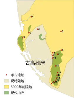 Taochiyuan (桃子園) shell mound is located in the northwestern part of the North Chaishan (北柴山). It is one of the earliest ruins discovered in Kaohsiung. Pottery, stone tools, and evidents of human burials were found in the region. This society belongs to the 牛稠子文化層, and later the 大湖文化層. Its economy was based on agriculture, fishery, and hunting.[1]