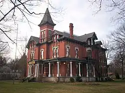 Initial growth in the area was slow, but eventually two small villages would develop due to the potential power generated by the Cuyahoga River that could be used in gristmills and manufacturing. Originally, there were two waterfalls in what is today downtown Kent, one of seventeen feet and another of twenty-five feet.[10] The first village, known as Franklin Mills or locally as the "Lower Village," developed mostly around the original Haymaker property. In 1811 Jacob Reed purchased the Haymaker mill and the settlement was known briefly as Reedsburg until Reed sold the mill in 1817 and the name of Franklin Mills was restored.[9] In 1818 Joshua Woodard arrived in the area and began constructing buildings just north of the village forming the "Upper Village" that would come to be known as Carthage.[11] The two villages would become rivals for a time due to their close proximity to one another and the competing taverns which operated in them: the Woodard Tavern in Carthage and the Lincoln Tavern in Franklin Mills. By the time the Pennsylvania and Ohio Canal opened in 1840 and the construction of what is today downtown Kent was completed, the rivalry had effectively ended as did the distinction between the two villages.[12] Today, the site of Carthage is a residential and commercial area on Kent's near west side and is found in the name of the side street Carthage Avenue in the same area.[13]