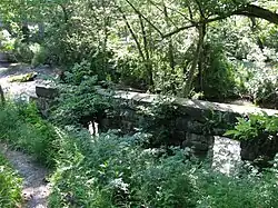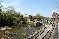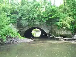 In the 1820s and early 1830s, plans were drawn up for the Pennsylvania and Ohio Canal, which would connect Pittsburgh, Pennsylvania and Cleveland, Ohio via Akron, Ohio. Franklin Mills was selected as part of the route and due to the rocky gorge of the Cuyahoga River, construction of a lock and dam was necessitated. When construction began on the Pennsylvania and Ohio Canal in the 1830s, land speculation was rampant in many areas of northeast Ohio along the canal, including Franklin Mills. As a result of this, an industrial and business region was established along the river in what is now downtown Kent. Factories and mills were either planned or constructed along the Cuyahoga River, some of which either were never built or ultimately failed, due mostly to effects of the Panic of 1837.[14] Much of the canal bed is still visible in downtown Kent, including the historic lock and arch dam (first built in 1836), which is the only known arch dam attached to a canal lock in the United States[15] and is listed on the National Register of Historic Places. In addition, an aqueduct of the canal is still visible in southern Kent where it crossed Plum Creek. The era of the canal would be relatively short-lived, lasting into the 1860s. By 1870 the canal was completely shut down.