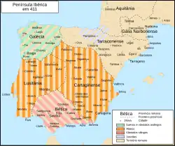 The Roman domination of the Iberian Peninsula entered into decay in the 5th century, with the invasions of the Alans, Vandals and Suebi, who had made an agreement in 409 with Magnus Maximus, pretender of the imperial title, and in 411 they divide the peninsula among themselves with the agreement of the emperor Flavius Honorius, leaving Lusitania to the Alans.[25] However, in 415 the Romans were forced to ask the Visigoths for help, due to the plundering by the Alans and Silingi Vandals.[25] The Visigoths thus invade the peninsula, which they came to dominate completely after the fall of the last colonies of Byzantium in 624.[26] In 622, Lagos was already a seat of a bishopric, since in that year its bishop attended a Toletan Council.[27] Silva Lopes, quoting the historian Faria e Sousa, confirmed the presence of a bishop based in Lagos, and who had the name of Servo, while Father João Baptista Coelho stated that the bishop of Lagos, called Servo de Deus, had attended one of the councils of Toledo during Sisebert's term as archbishop of Toledo.[27] Antonio Caetano da Costa Inglez, prior of the church of Santa Maria de Lagos, mentioned that according to several ancient authors, including the Spanish historian Ambrosio de Morales, the bishop of Lacobriga had been in the fourth, sixth and seventh councils of Toledo.[27]
