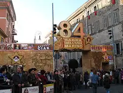 The plague of 1656 hit Marino and Grottaferrata hard, dramatically reducing Marino's population by more than half,[62] so much so that the Colonna family, in order to repopulate the fiefdom, was forced to encourage immigration from their Abruzzo fiefdoms. At the end of the epidemic, the survivors developed a strong devotion to St. Roch, so much so that an oratory was built for him along the Via Maremmana Inferiore in the locality now named after the saint, whose feast day of August 16 was celebrated at least until World War II.[73]