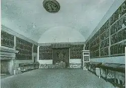 Between 1837 and 1838 a cholera epidemic developed in the Roman area. The City Council of August 12, 1838 made urgent decisions regarding a possible development of the epidemic in Marino, as suggested by the Supreme Tribunal of Health: 500 scudi were allocated to set up a sanitary hospital, "the requisition of linen beds not being allowed, and pecuniary subsidies from pious places and wealthy families to provide for the current expenses;"[98] in addition, it was considered to call a second doctor to the city in case the epidemic developed; and finally, it was determined appropriate to locate a place to bury any dead as a result of the epidemic.[99] At the end of the epidemic, since cholera had not claimed any victims in the city, the people of Marino dedicated the narrow escape to Our Lady of the People, a miraculous image kept at the basilica of St. Barnabas:[100] at a city council meeting on October 3, 1838, it was decreed that a silver lamp be donated, which the Confraternity of the Most Holy Rosary was to light in front of the sacred image.[101]