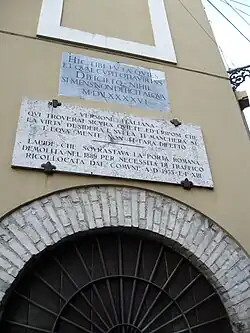 In order to repopulate the fief, Marcantonio Colonna on December 26, 1574, issued a patent in which he promised exemption for four years from all royal and personal service to anyone who wished to become his vassal in the land of Marino, in exchange only for an oath of loyalty and obedience.[62] The appeal probably did not fall on deaf ears, as the population increased considerably over the next sixty years, even exceeding a thousand inhabitants and necessitating the construction of a new, imposing and capacious parish church such as the basilica of St. Barnabas. Following a disastrous fire that had destroyed the town of Rocca di Papa in March 1577, the people of Marino housed their neighbors from Rocca di Papa while waiting for their town to be rebuilt.[62] In the meantime from the urbanistic point of view the current Corso Trieste (called in the seventeenth century "Strada Larga") began to take shape, since Cardinal Giovanni Battista Castagna (a friend of Marcantonio Colonna, later to become Pope Urban VII) had a palace built there around 1583 with a remarkable facade enriched with peperino friezes. In April 1580 a community of Augustinian religious settled at the church of Santa Maria delle Grazie, which until then had belonged to the wealthy and ancient Confraternity of the Gonfalone of Marino.[66]