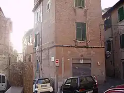 In the late Middle Ages the village expanded progressively southeastward along the peperino hill on whose summit -373 m a.s.l., today Piazza Giacomo Matteotti- the Frangipane family had a four-sided fortress built, demolished at an unspecified time and of which three round towers remain incorporated in the surrounding buildings. The new expansion corresponds to the present districts of Santa Lucia and Coste, and was traversed by the important thoroughfare of Via Santa Lucia and Via Posta Vecchia: the denomination of the latter street denounces that most likely this was originally the route of the courier and postal route between Rome and Naples, which passed through Marino until the 1780s.[36]
